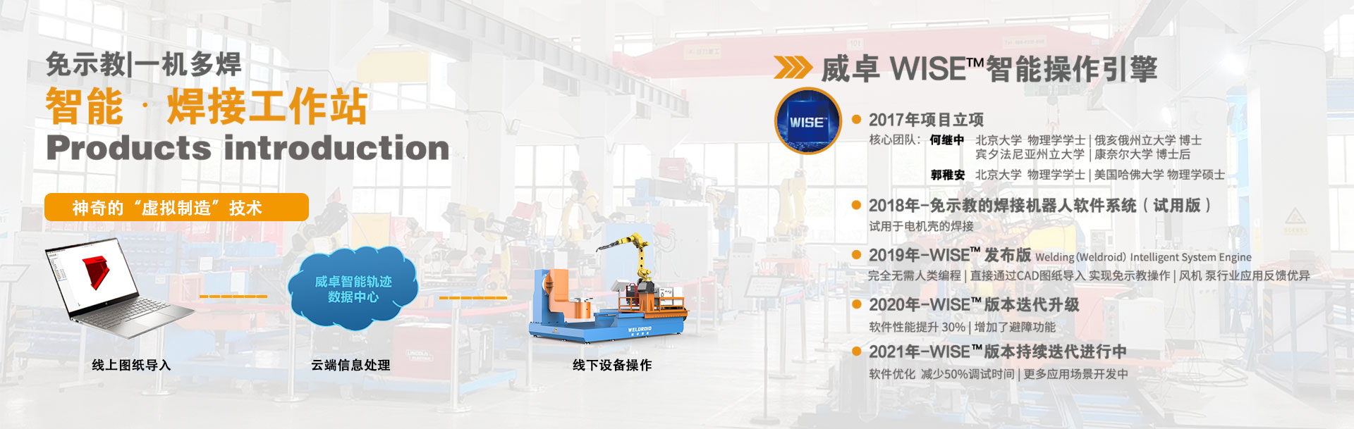 立即咨詢 現在聯系我們:0510-85384033無錫威卓智能機器人有限公司成立于2017年,是無錫市政府引進的科技領軍型高新技術企業,公司研發(fā)團隊80余人,我們堅持自主創(chuàng)新,利用自主開發(fā)的虛擬制造技術對傳統焊接行業進行升級改造。 公司主推的工業風機系列-智能焊接工作站產品,具有免示教、實時跟蹤、簡易工裝、傻瓜式操作等優(yōu)點,真正幫助企業解決了招焊工難,用工成本高,焊接質量不穩(wěn)定等問題。